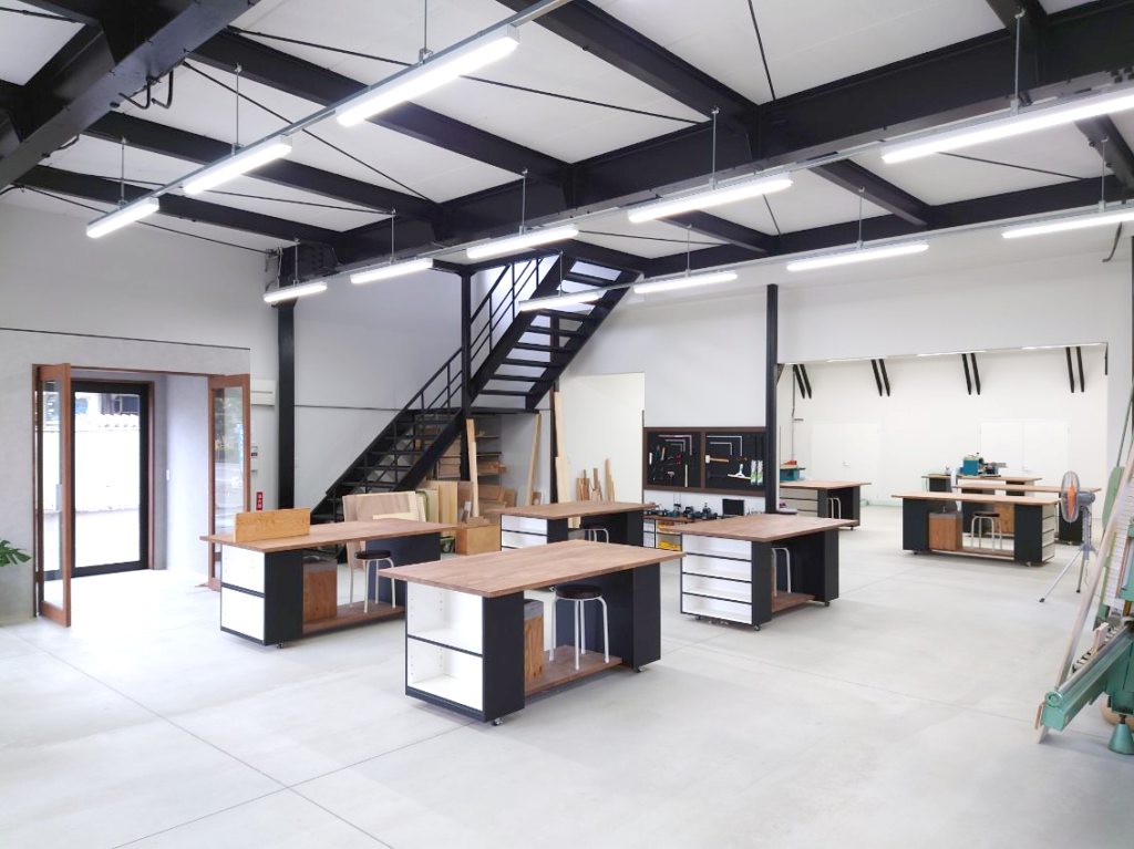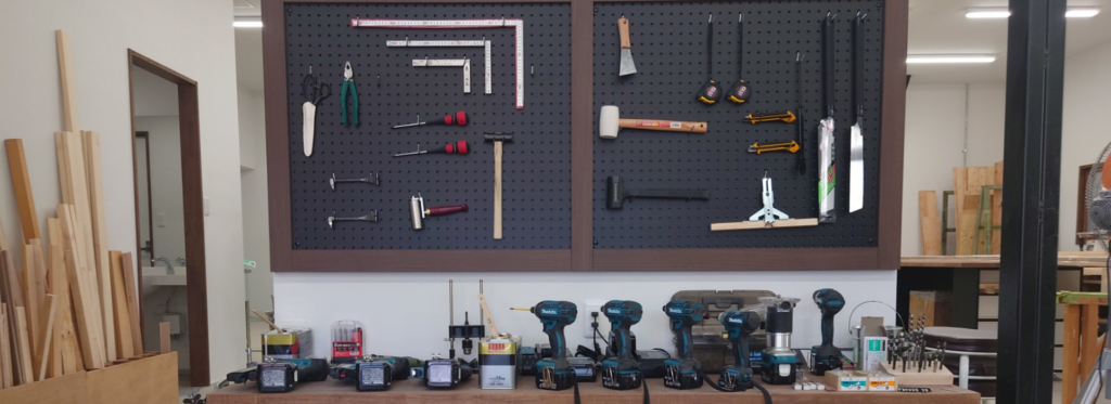 自分でオリジナルの家具を作ってみたいが、道具もなくスペースも無いというお客様へ場所や道具の提供をしたいと思い工房を造りました。